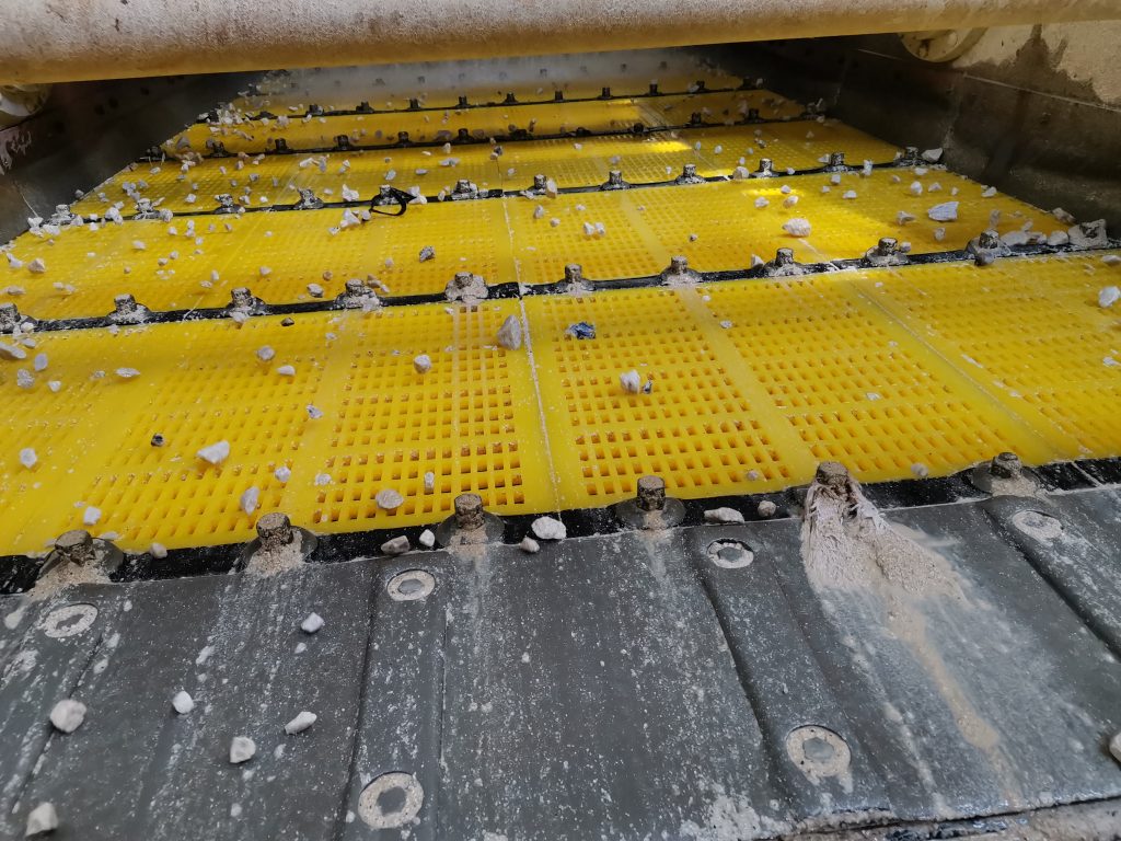 ? ? 無奈之下,宜春鉭鈮礦的工作人員準(zhǔn)備使用某國外著名品牌的橡膠篩網(wǎng),但更換成本高、改造時間長等因素讓他們一直猶豫。在猶豫之時,南昌鑫力的技術(shù)人員為他們帶來了滿意的解決方案,即不改變原篩網(wǎng)結(jié)構(gòu)型式,將原來14x30mm的孔改為12x30mm,將普通聚氨酯篩網(wǎng)更換為南昌鑫力生產(chǎn)的MDI雙硬度防堵篩網(wǎng)。該方案得到了江鎢集團(tuán)領(lǐng)導(dǎo)和宜春鉭鈮礦領(lǐng)導(dǎo)的認(rèn)可,雙方于2020年3月簽訂了合同,4月26日篩網(wǎng)安裝完成并投入使用。