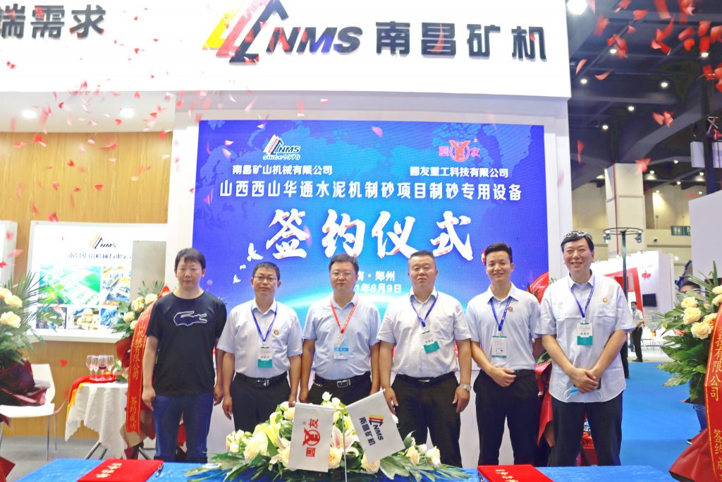 ? ? 9號上午,南昌礦機展位舉辦了山西西山華通水泥機制砂項目制砂專用設(shè)備簽約儀式,南昌礦機總裁龔友良與山東圓友重工科技有限公司(下稱“圓友重工”)副總經(jīng)理李冠堅進(jìn)行了簽約,標(biāo)志著展位上展出的HFS液壓高頻篩和VSD雙腔立軸破碎成功售出。