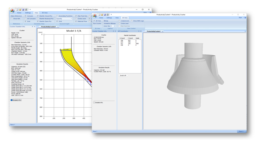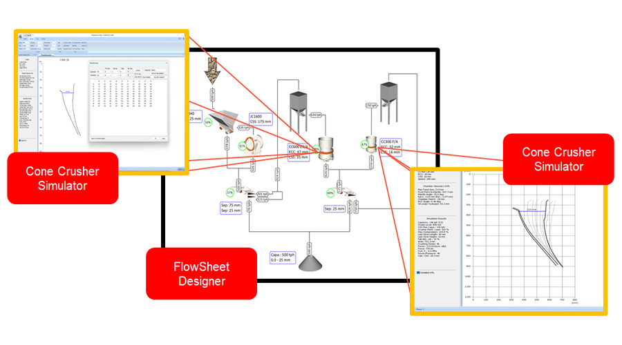 結(jié)合信息化技術(shù)開發(fā)出的一款具有自主知識產(chǎn)權(quán)的破碎機(jī)設(shè)計優(yōu)化模擬軟件Cone Crusher Simulator,配合NMS的流程設(shè)計軟件Flow sheet designer提供設(shè)備生產(chǎn)性能預(yù)測,為前期工藝流程設(shè)計中的設(shè)備選型提供有效的數(shù)據(jù)支撐,降低工藝設(shè)計期望與實際生產(chǎn)效果之間的差異。